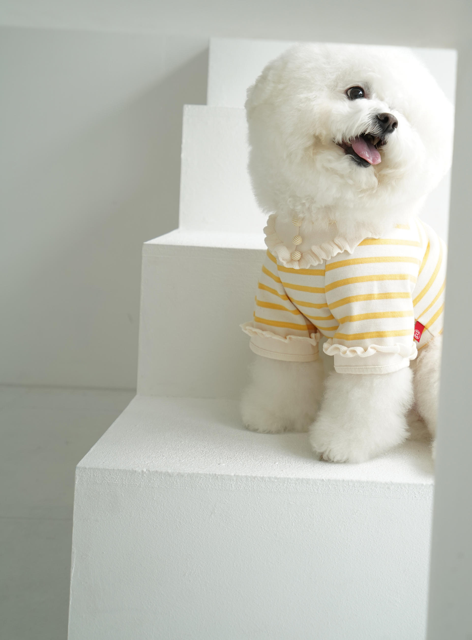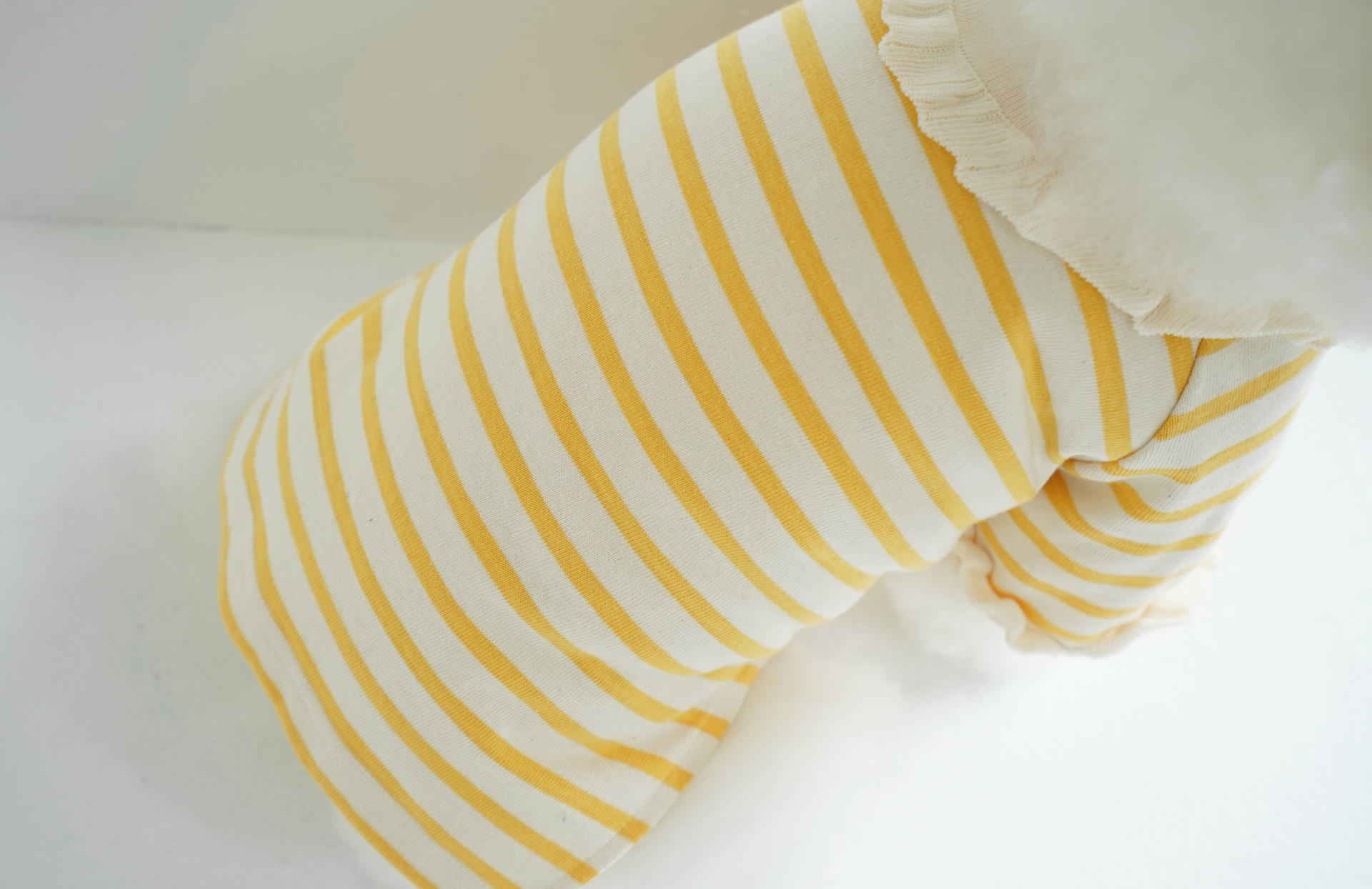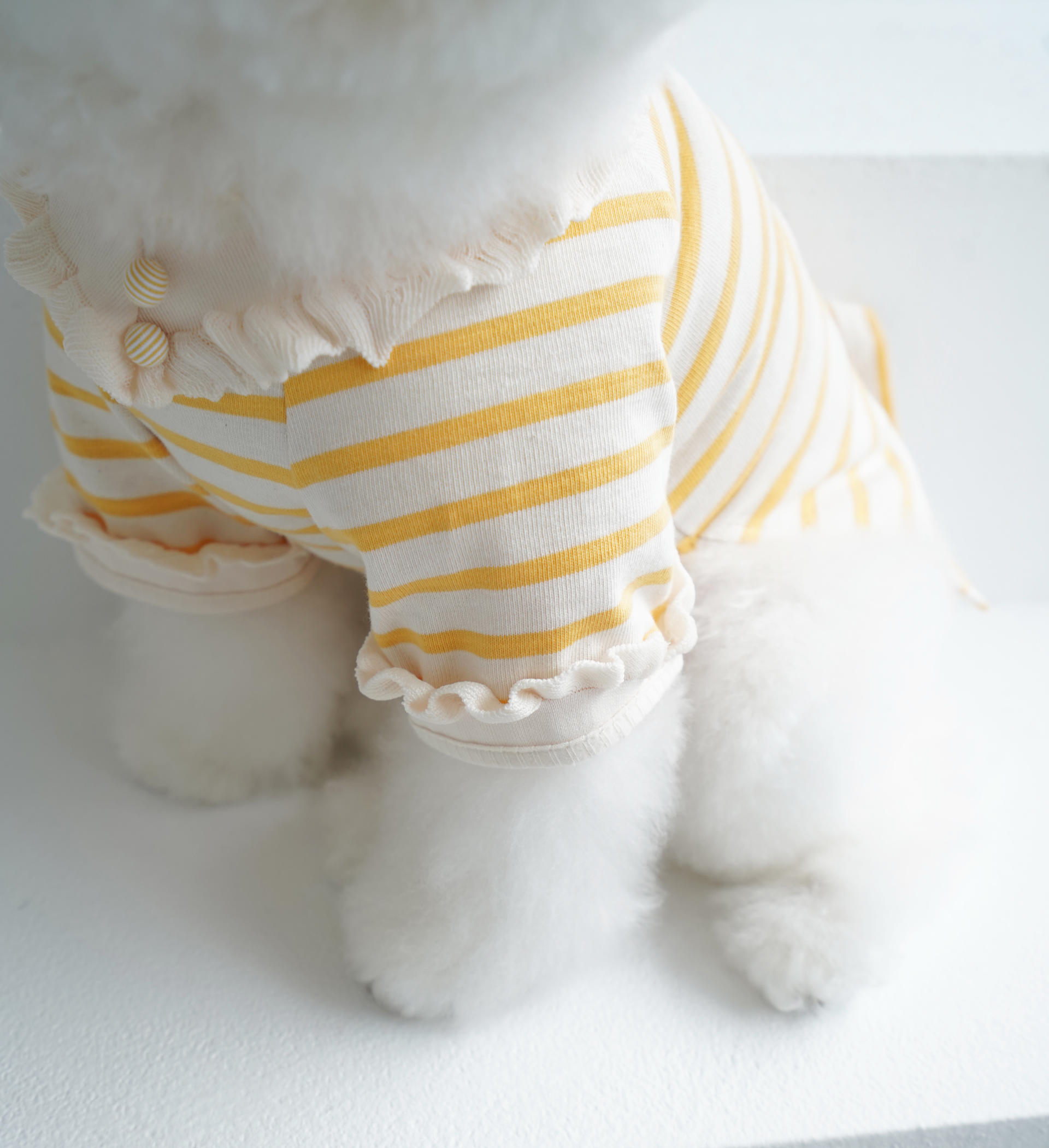 여름 니트지 소재로 된 목과 소매의 프릴, 가는 스트라이프의 노란색 단추가 달려있어 앞모습이 한층 더 귀여움을 연출할 수 있습니다.