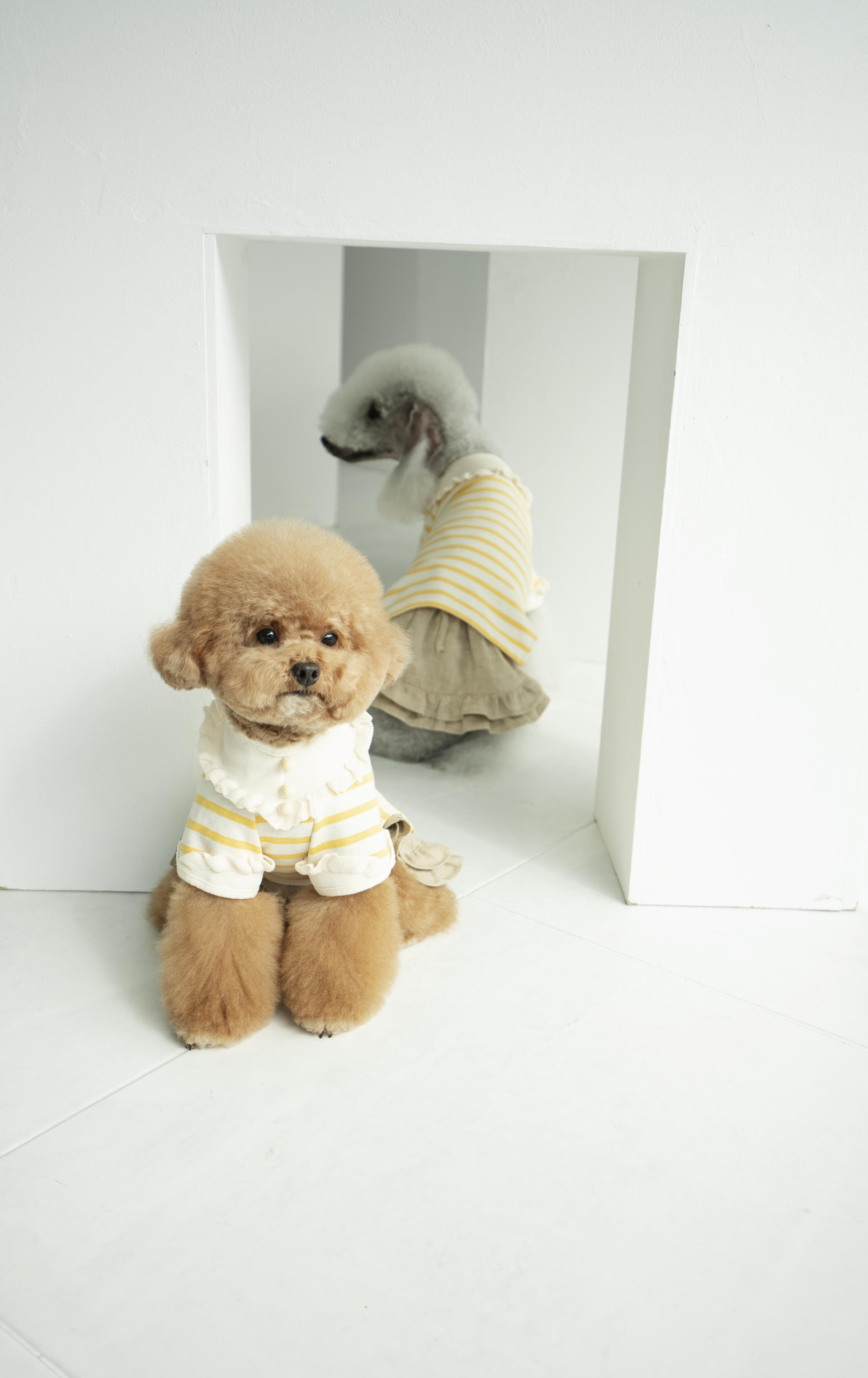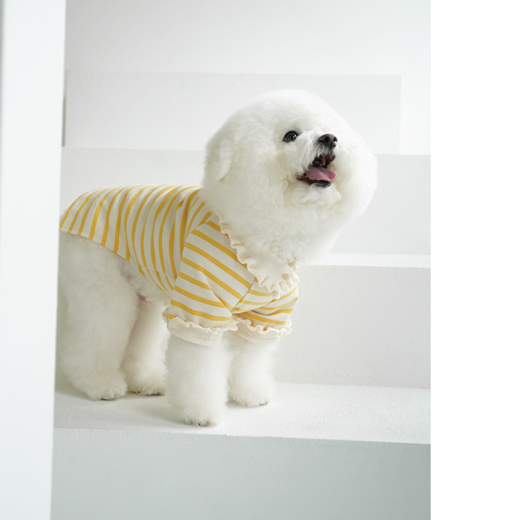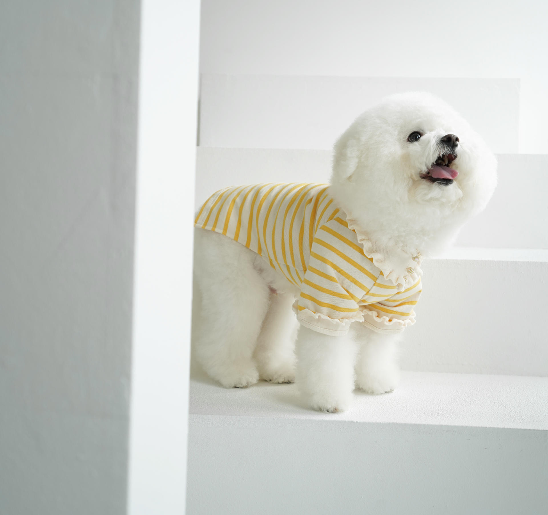 여름 니트지 소재로 된 목과 소매의 프릴, 가는 스트라이프의 노란색 단추가 달려있어 앞모습이 한층 더 귀여움을 연출할 수 있습니다.