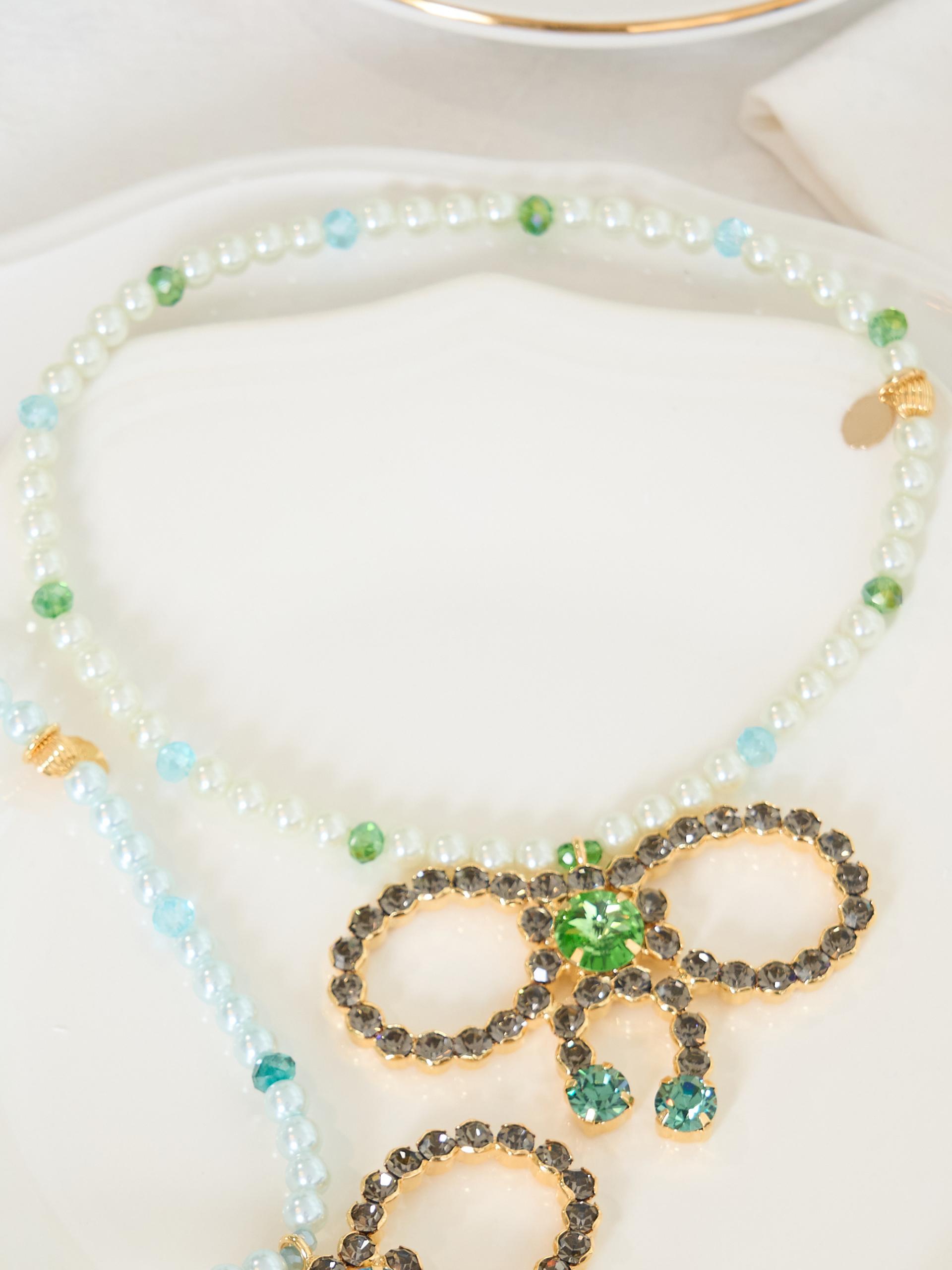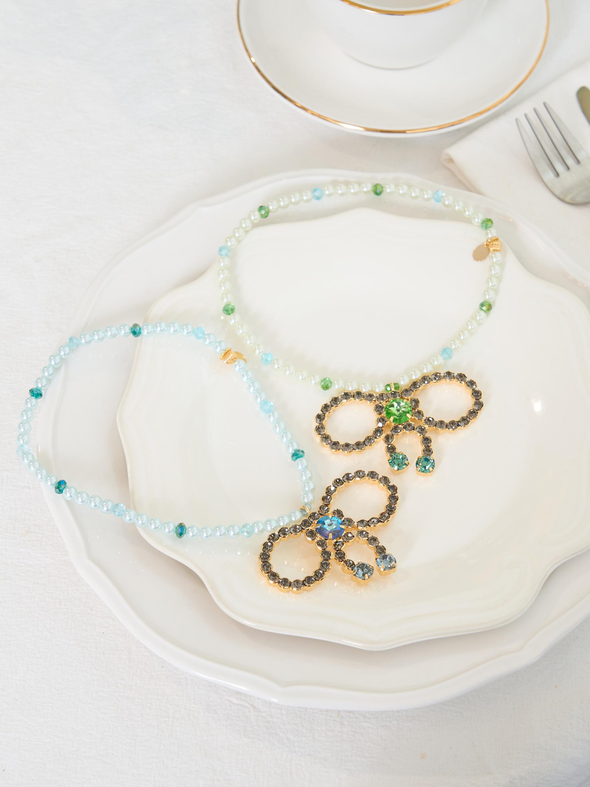 전체가 크리스털로 제작된 리본 모양의 펜던트 목걸이입니다.