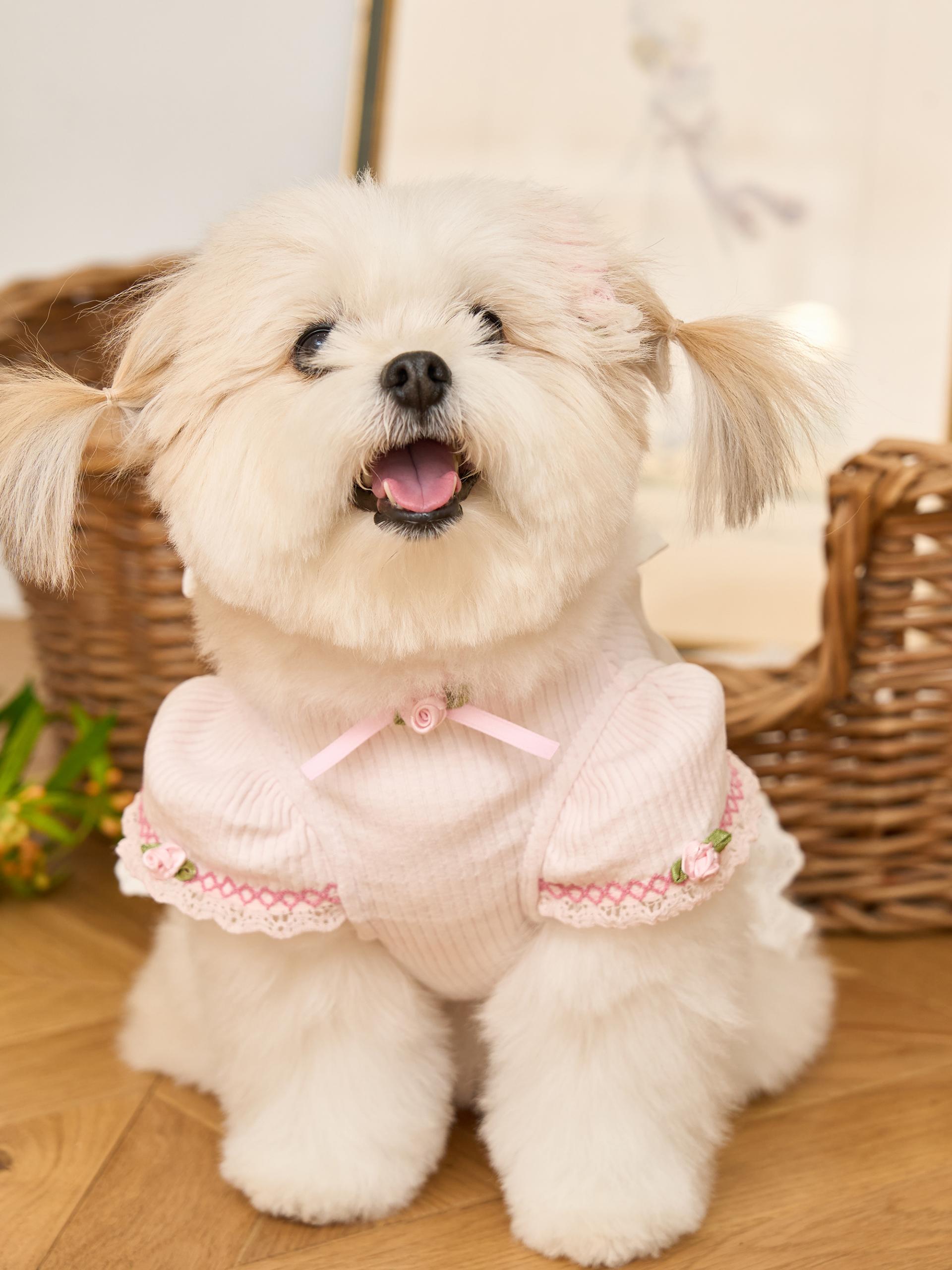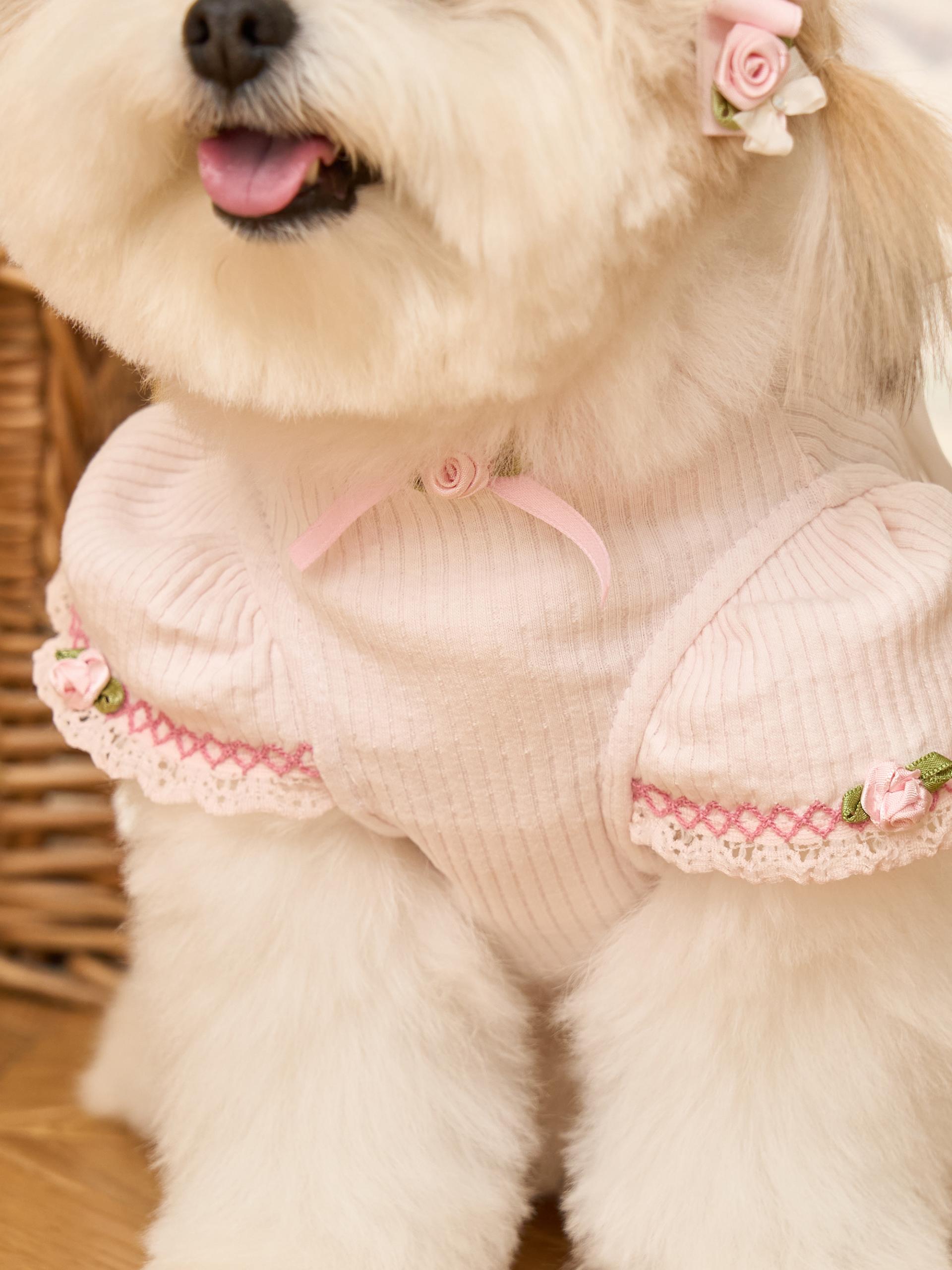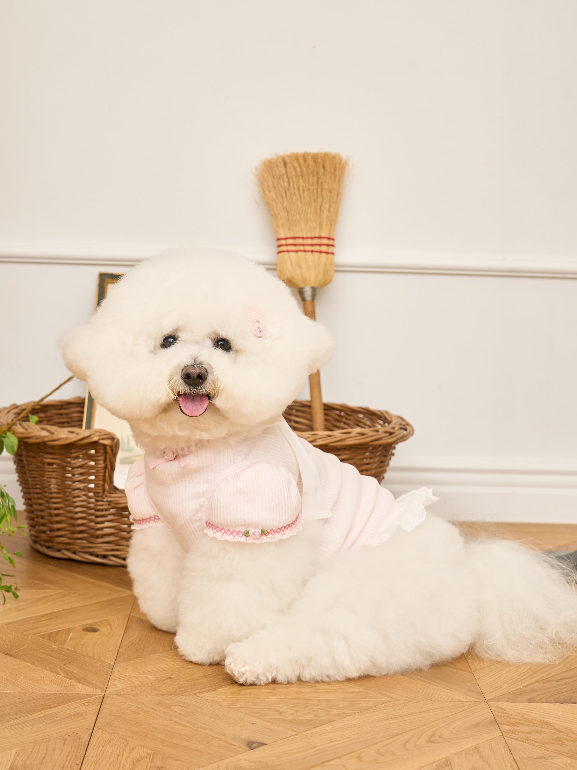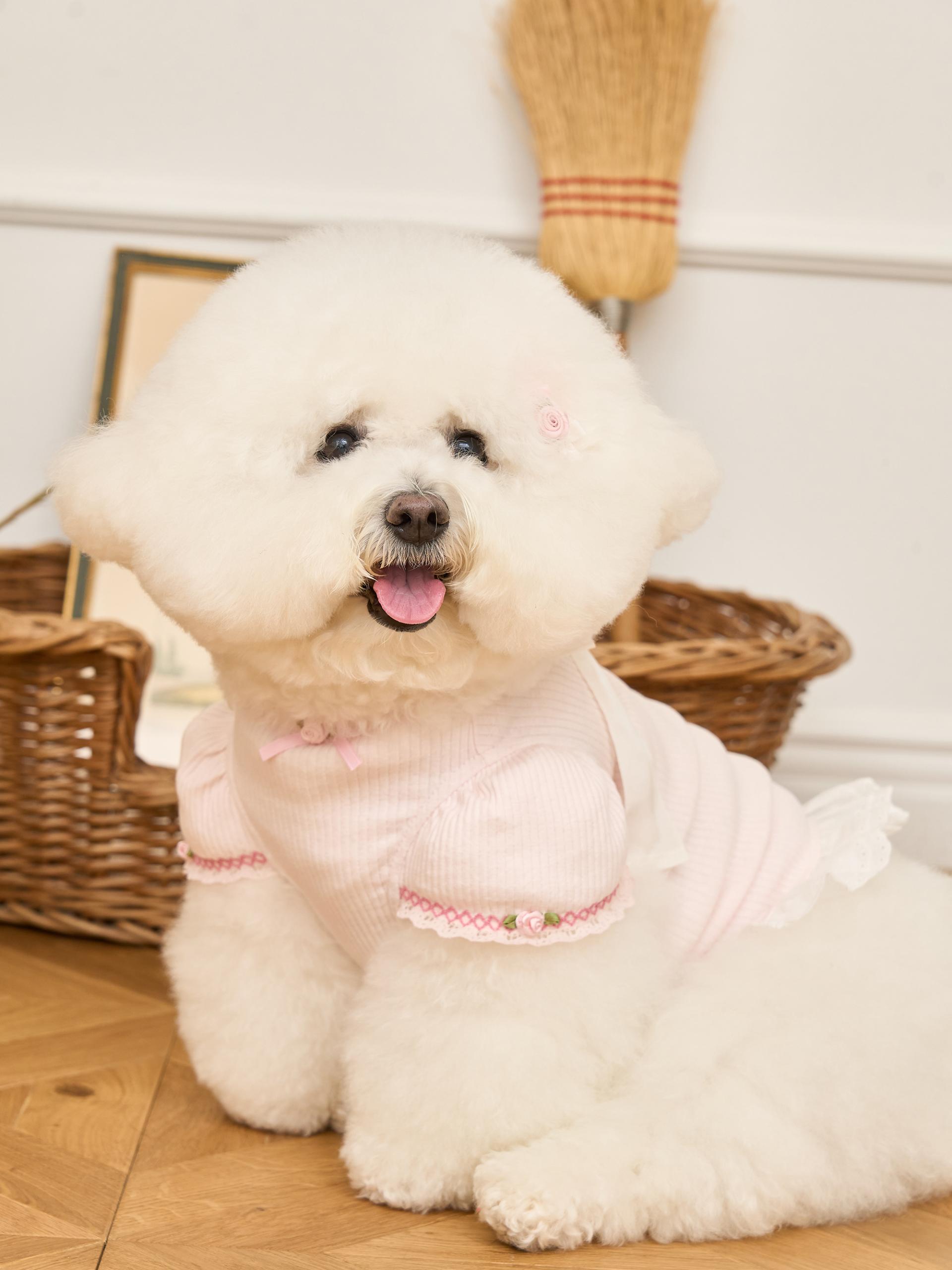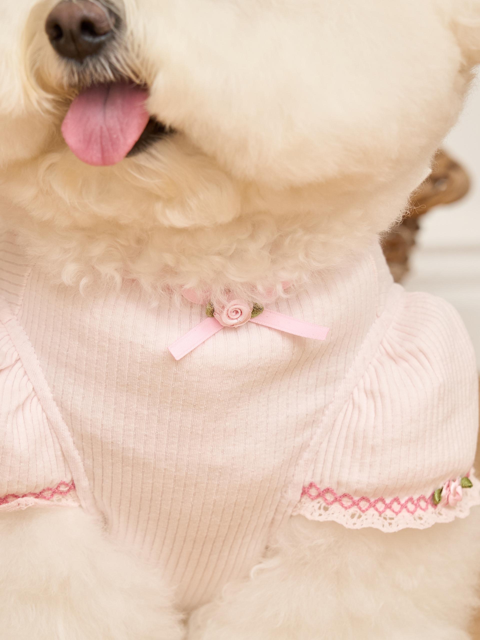네크와 소매에 작은 장미꽃 자수 장식이 더해져,