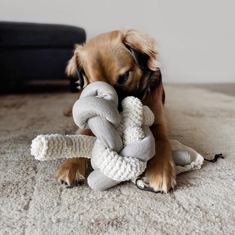 풍부화 장난감인 누는 간식을 매듭에 숨길 수 있고 반려동물이 매듭을 성공적으로 풀면