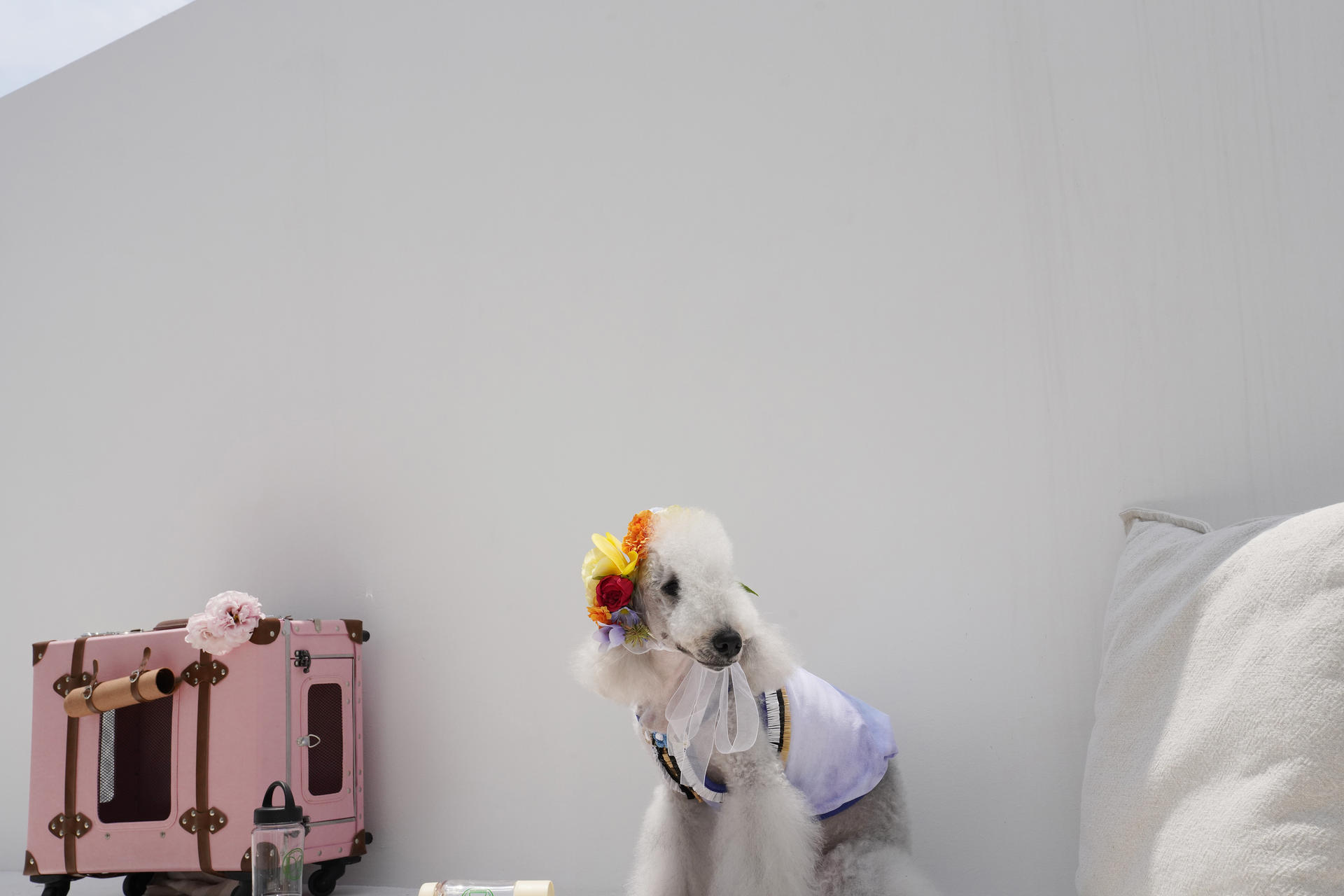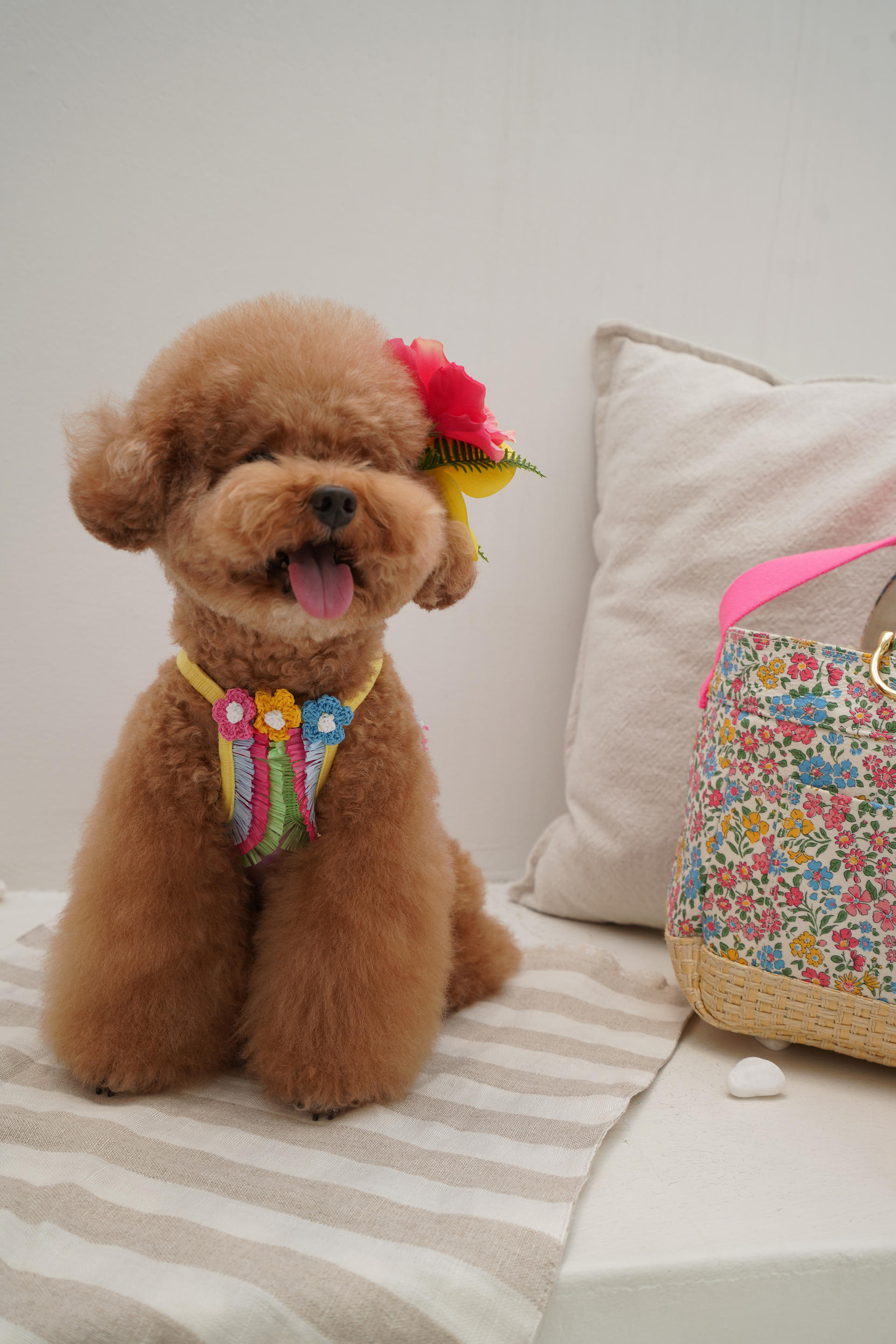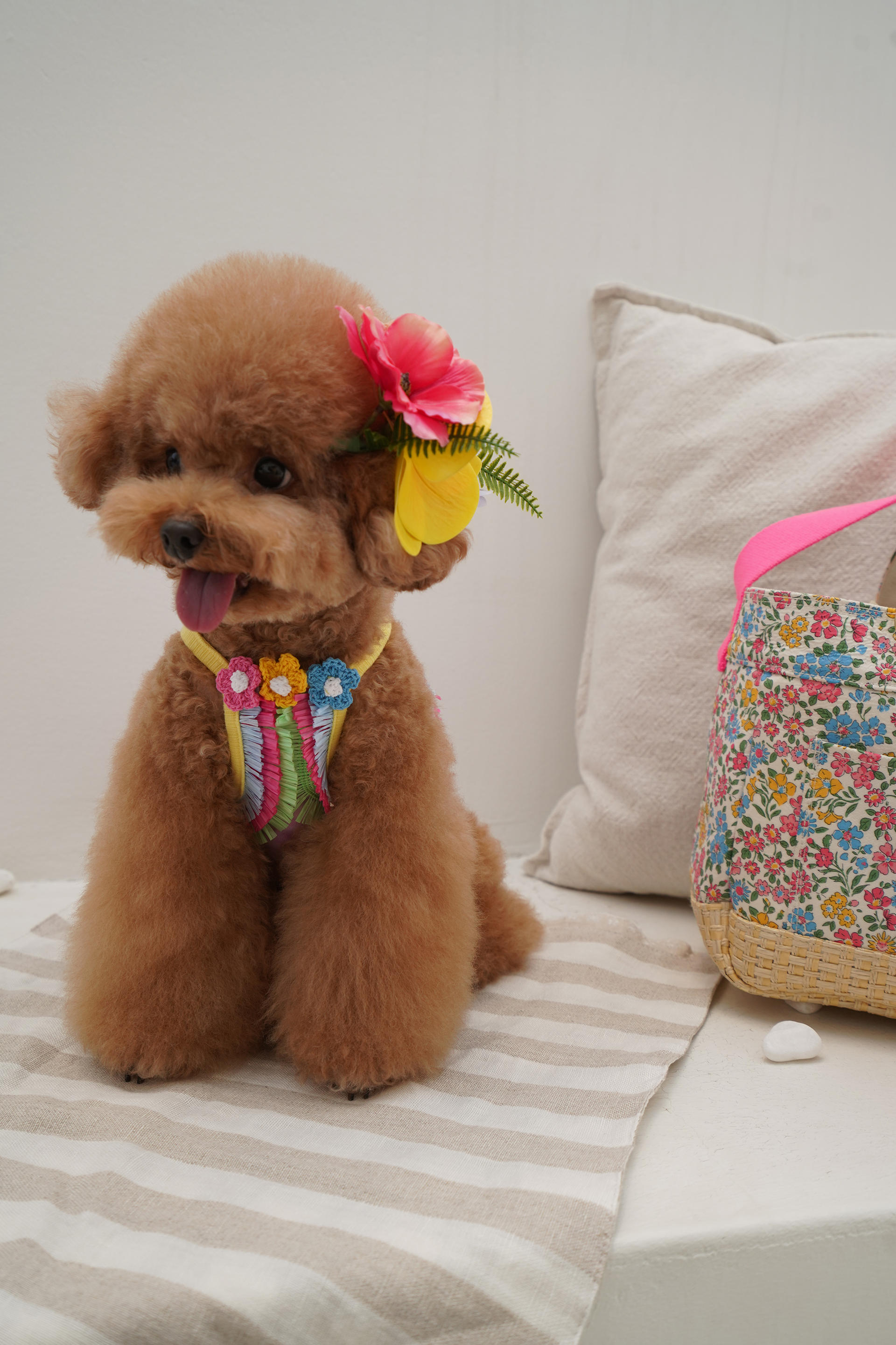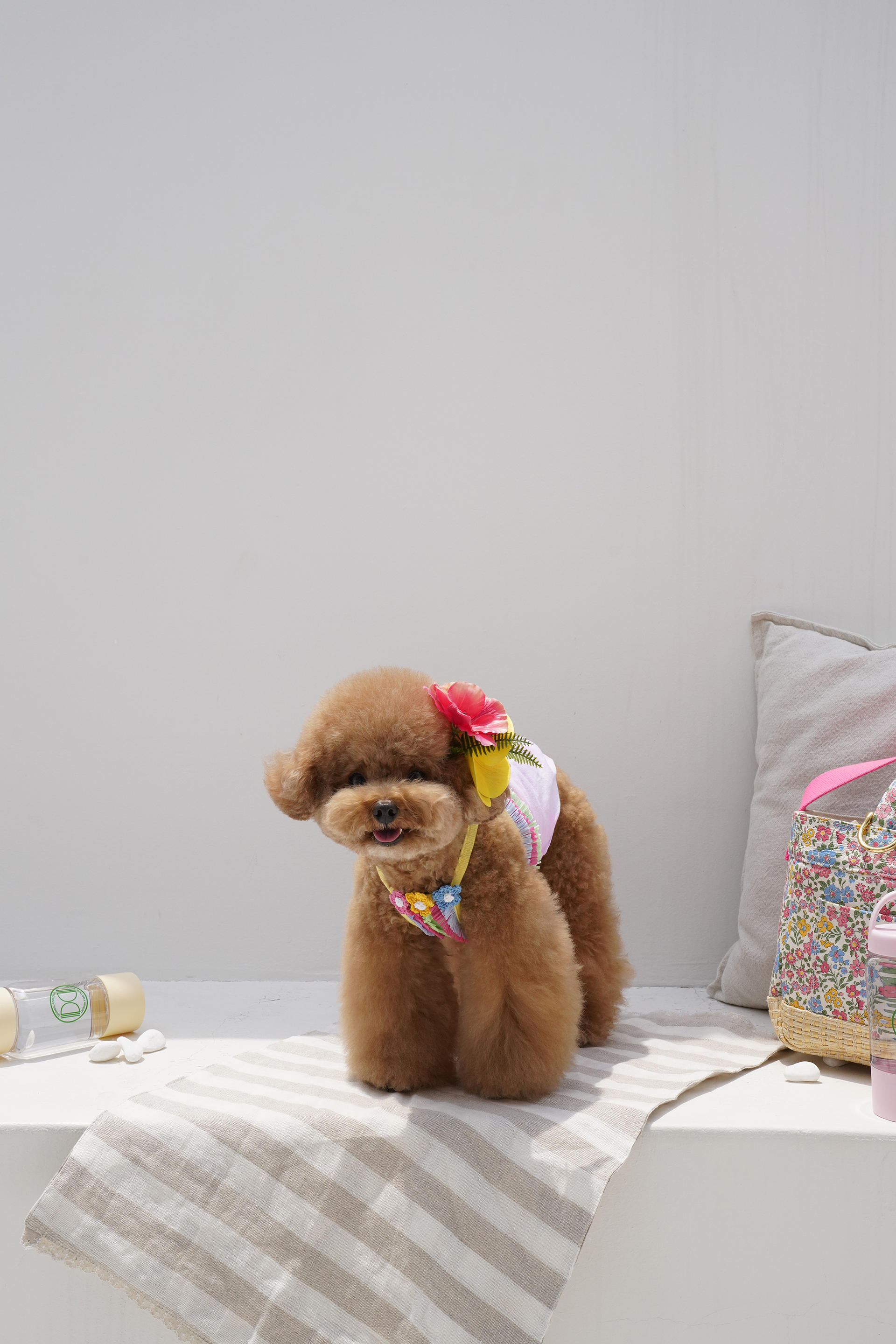 포인트 플라워 코사지로 장식한 하와이안 탑과 하와이안핀을 함께 매치해