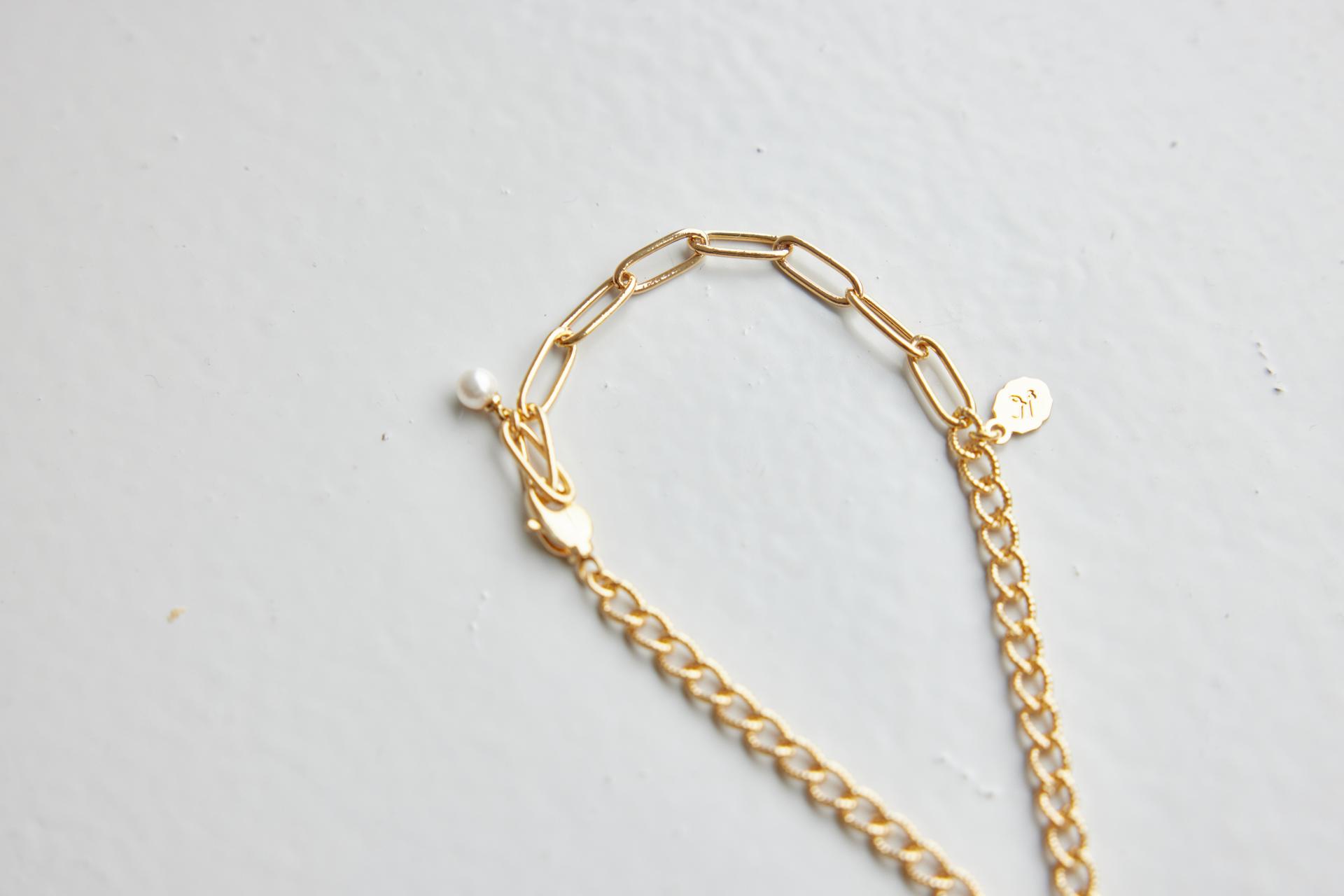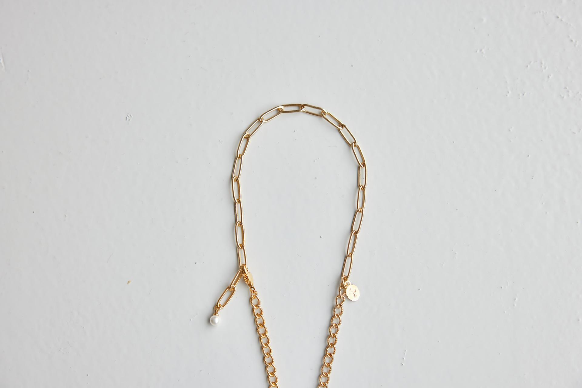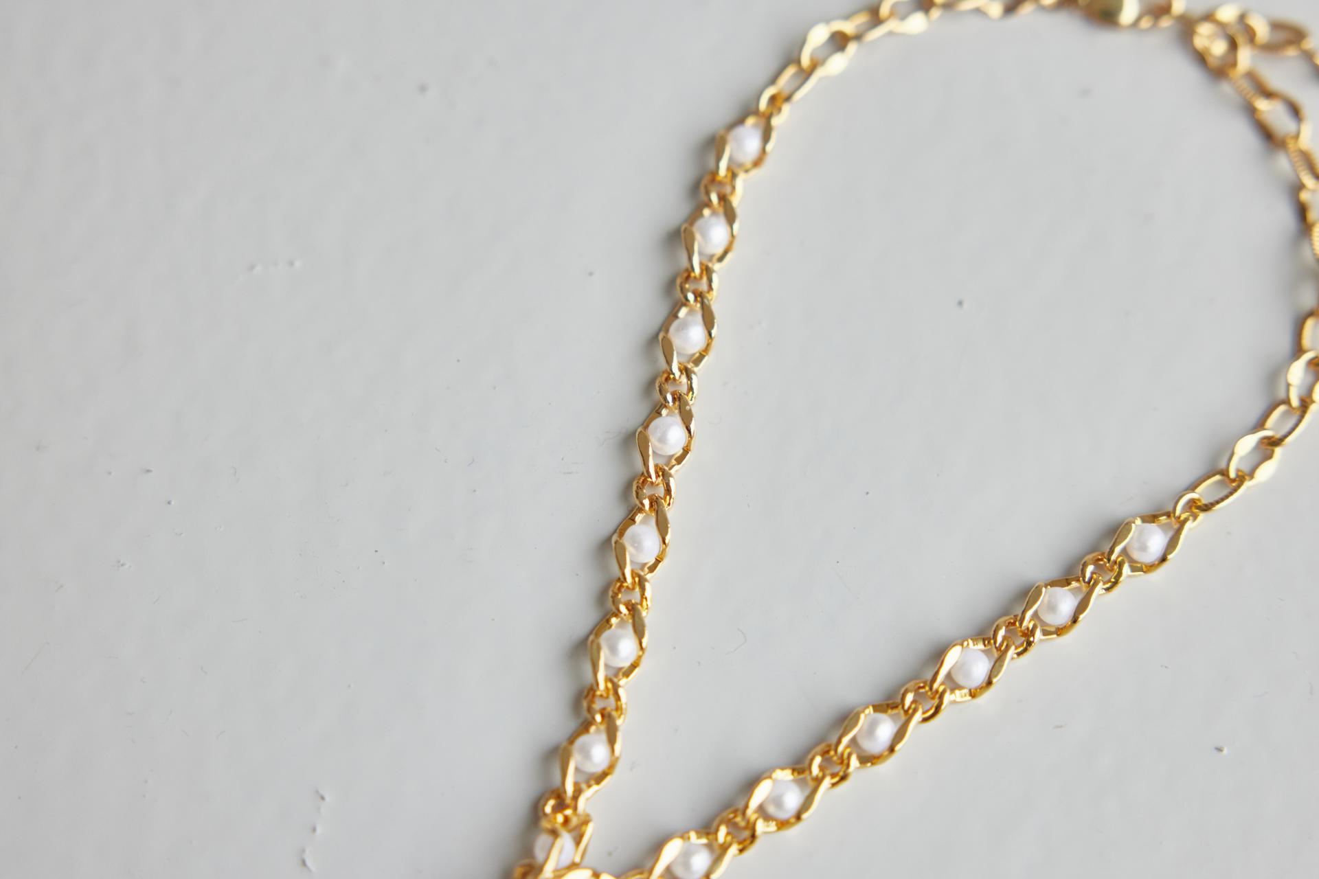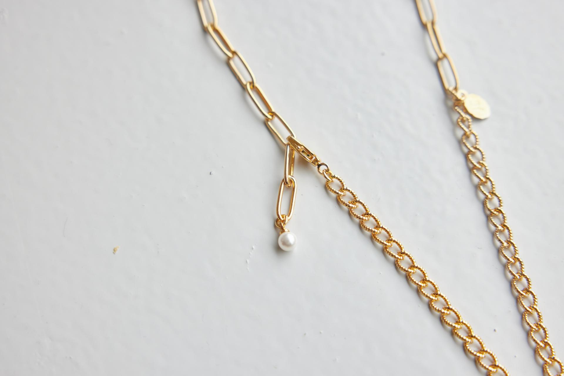 메탈체인사이에 진주가 들어간 유니크한 체인입니다. 카빙체인과의 조합으로 착용감이 더 편안하고 사이즈 조절이 용이 합니다.