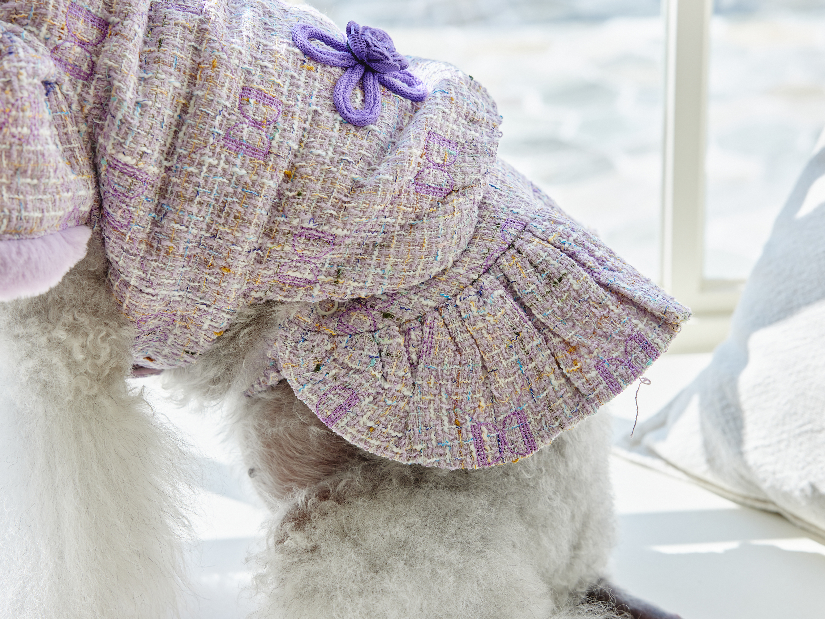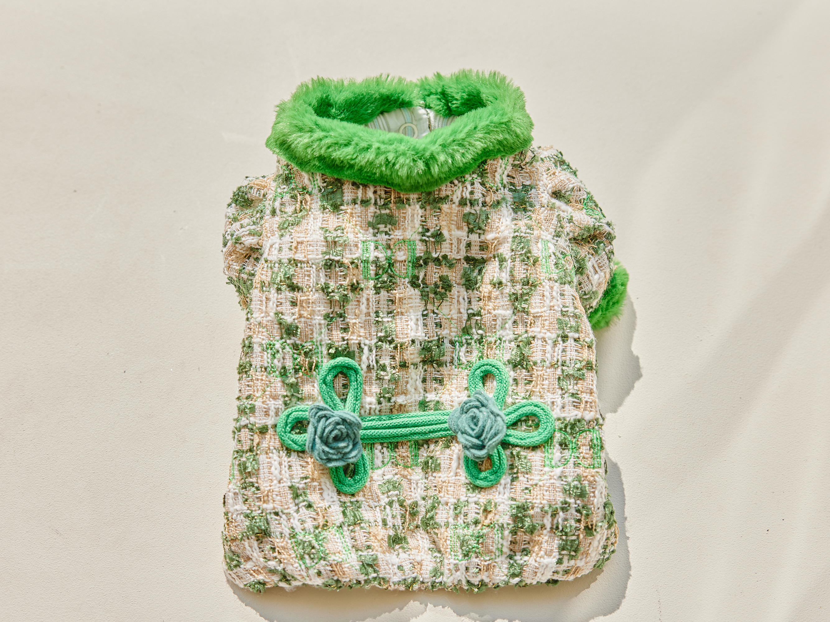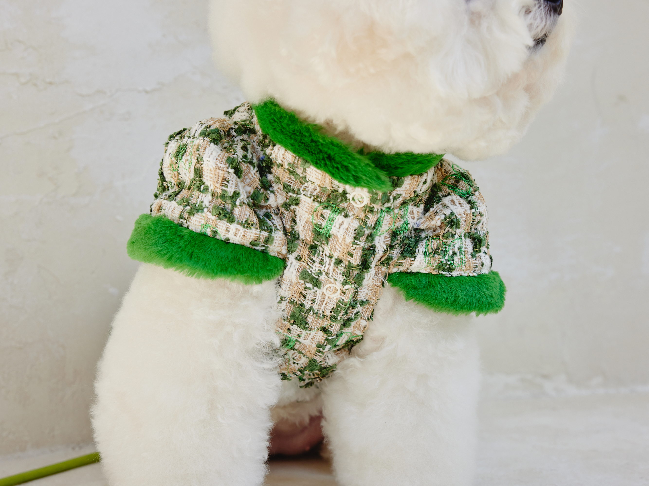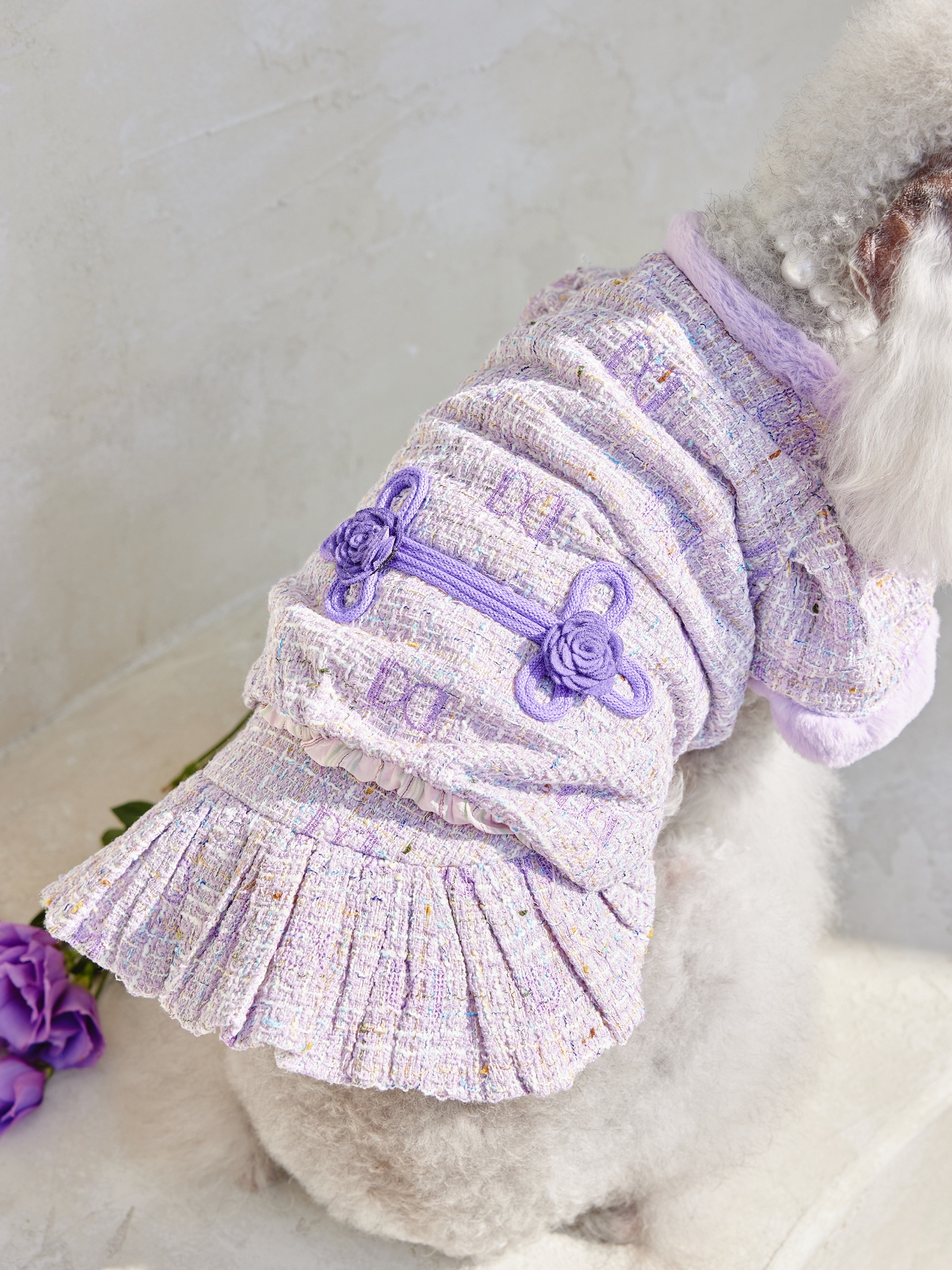 예쁜 트위드 원단에 컬러 라이닝을 넣고 디자인포도그 자수를 박은 자켓에
