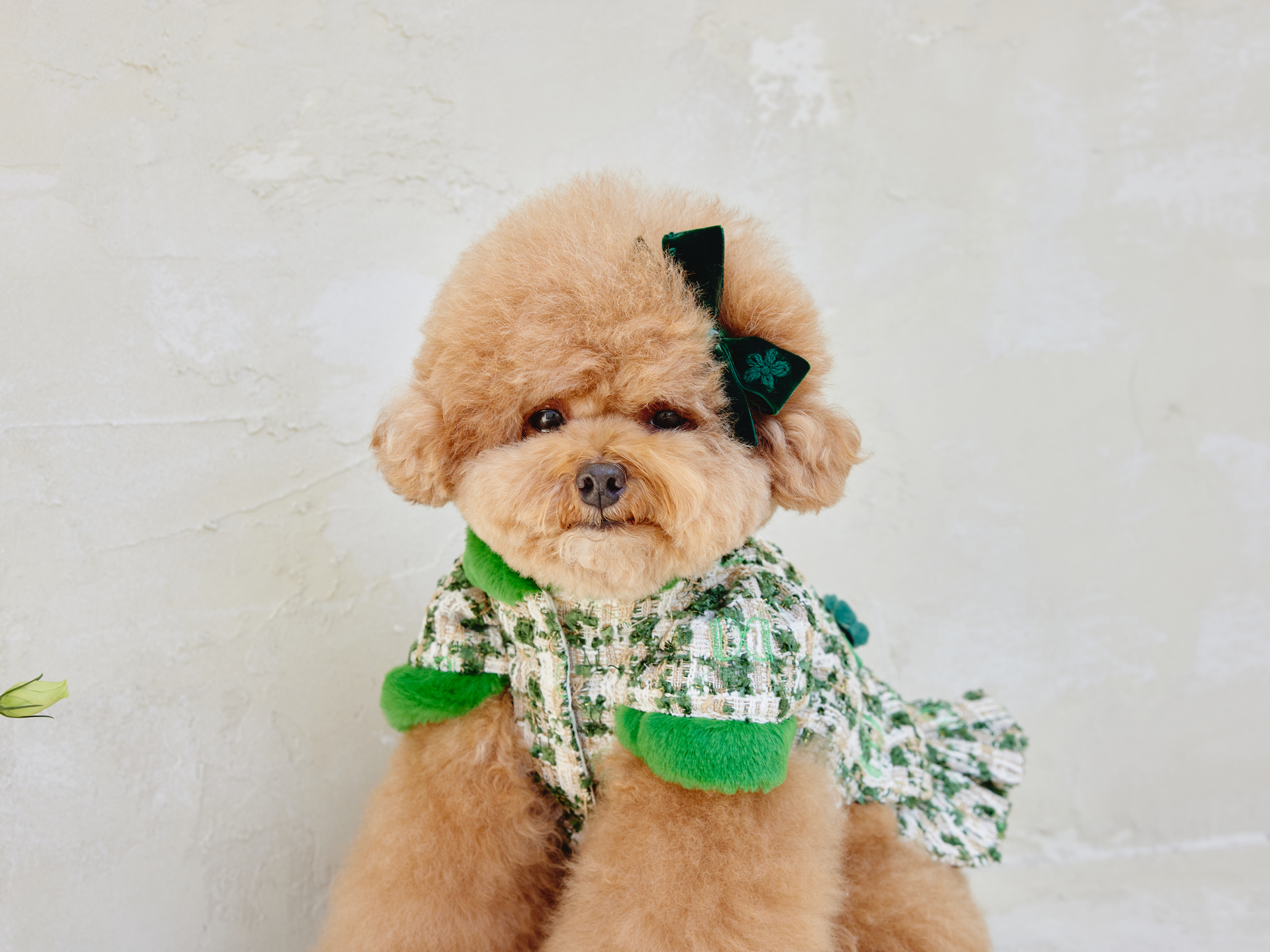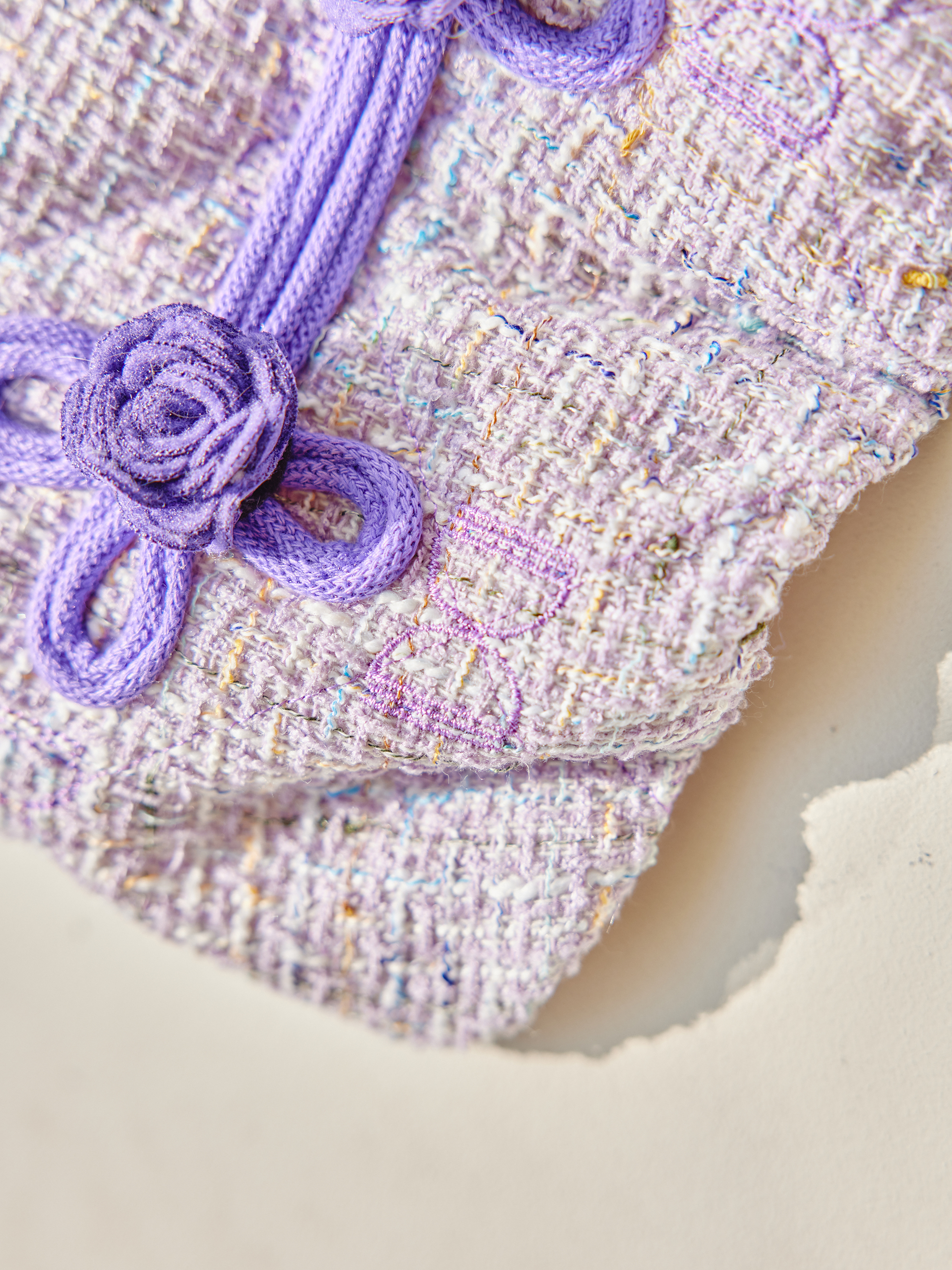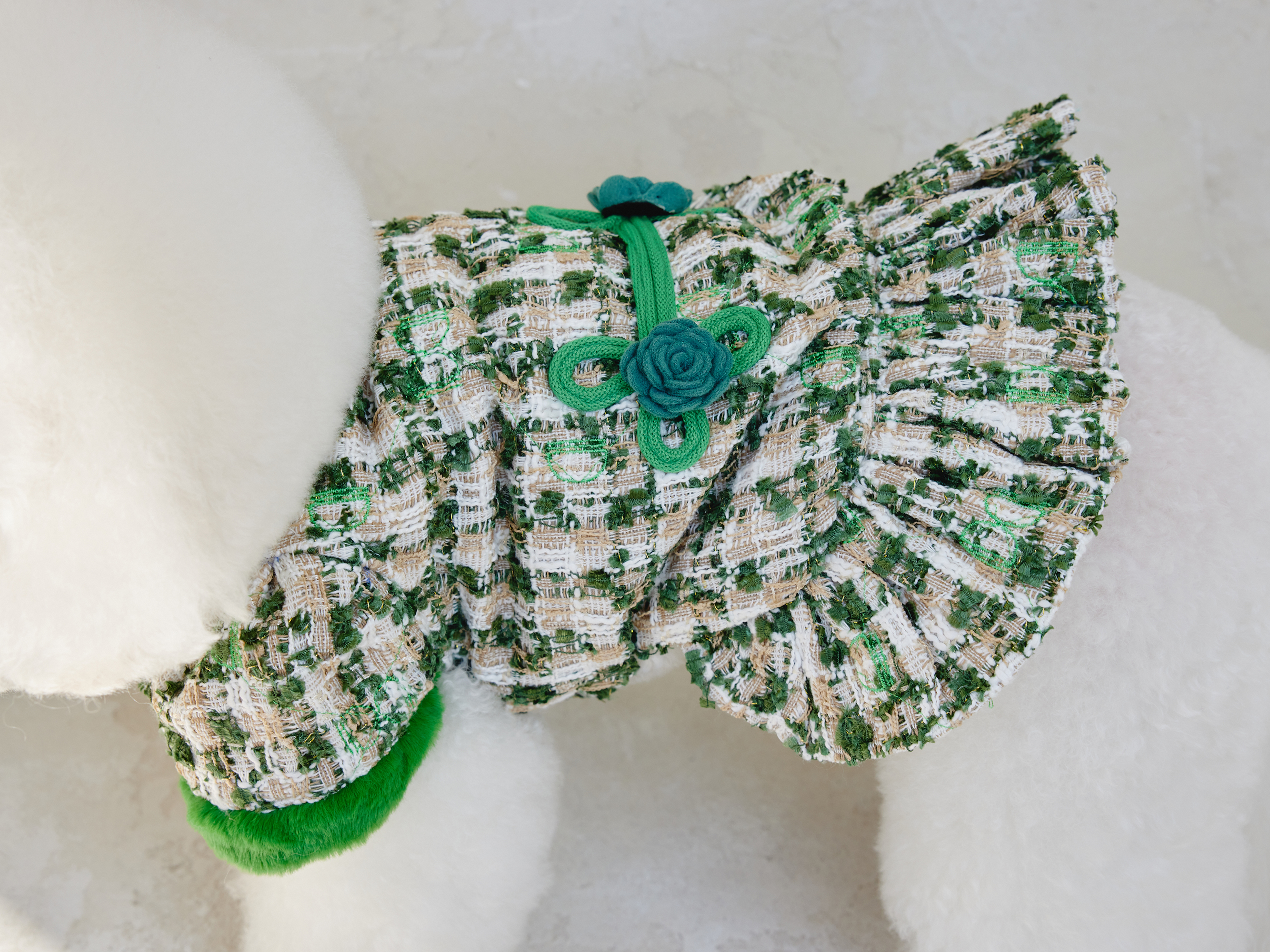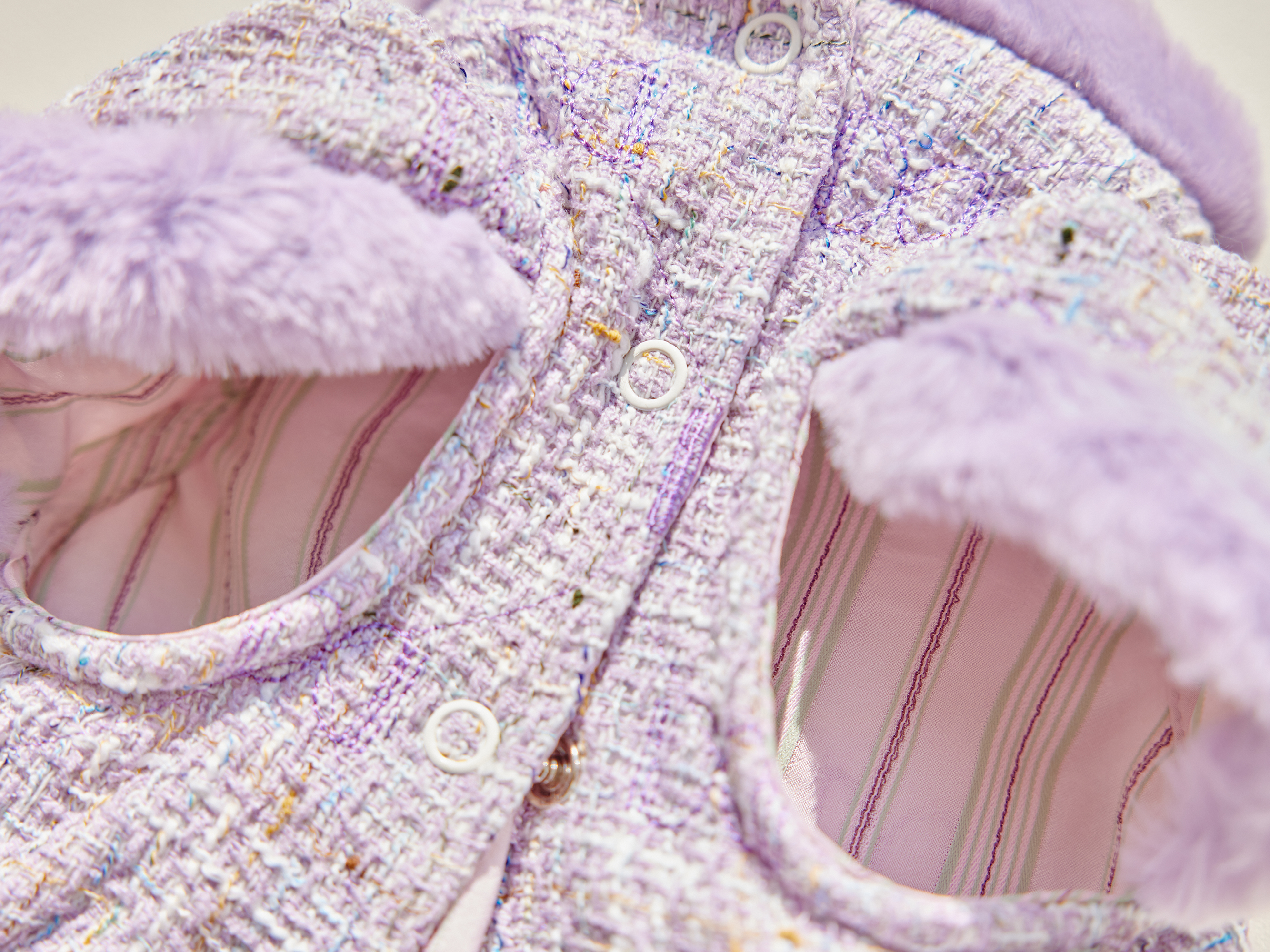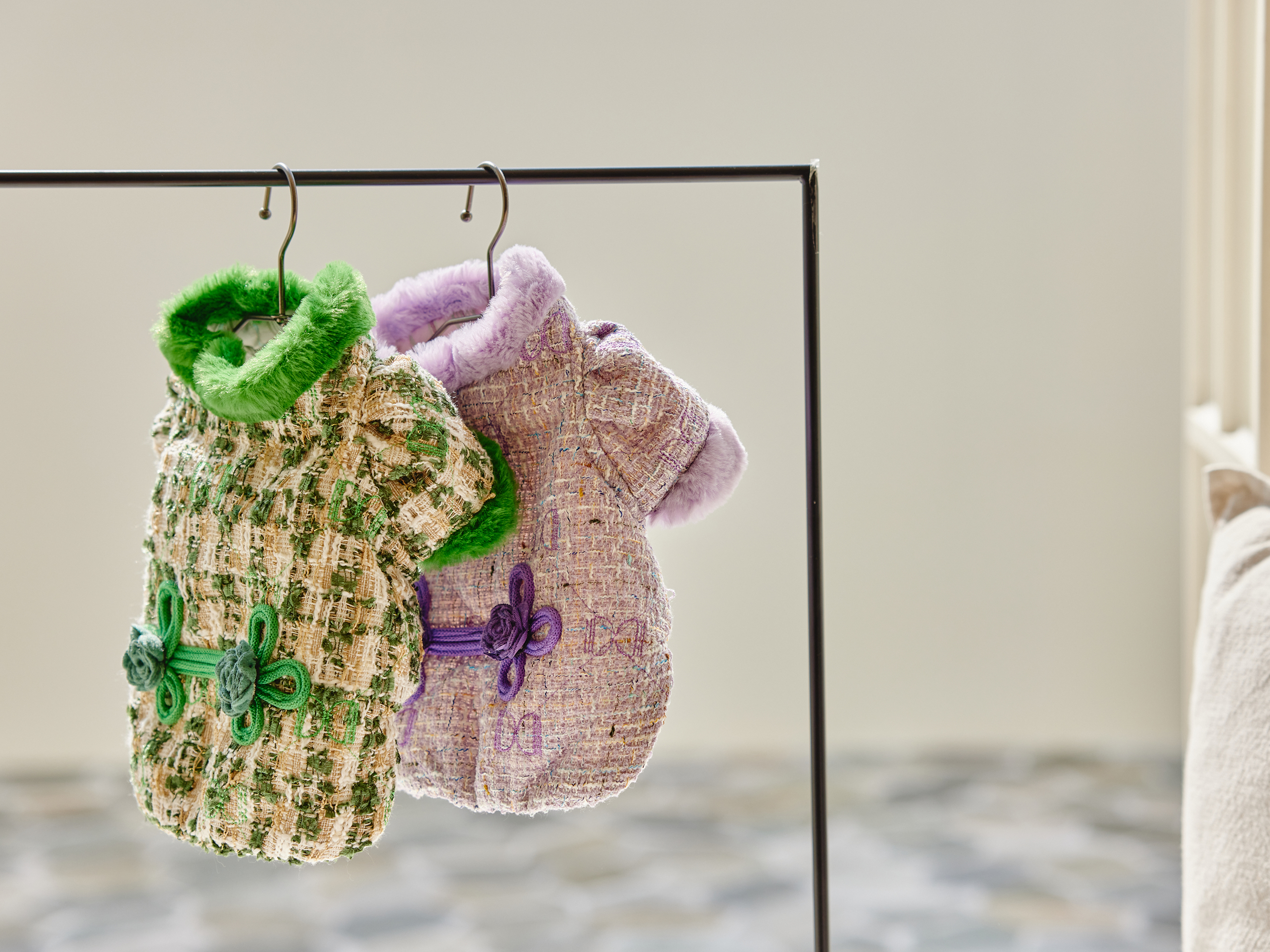 예쁜 트위드 원단에 컬러 라이닝을 넣고 디자인포도그 자수를 박은 자켓에