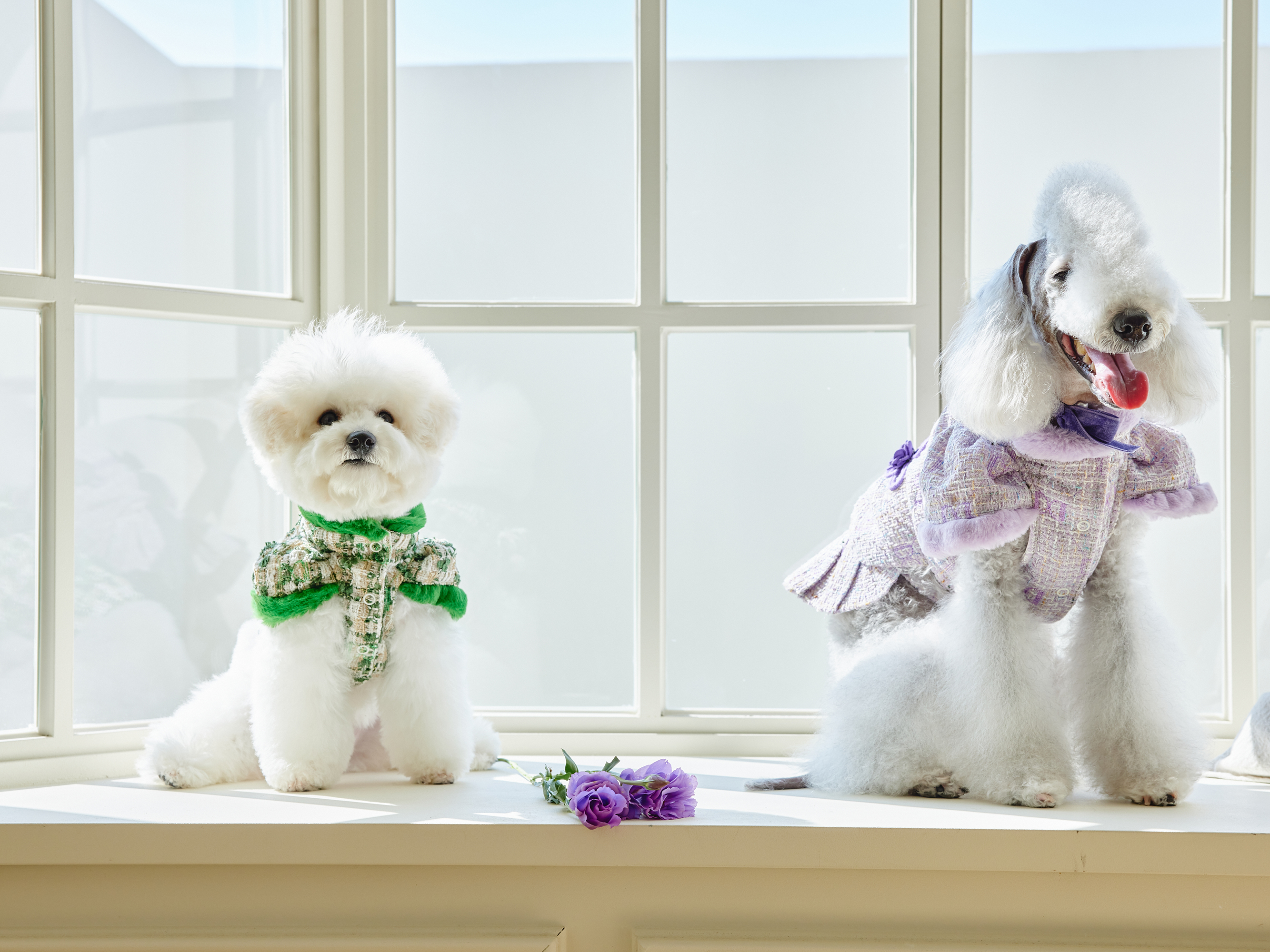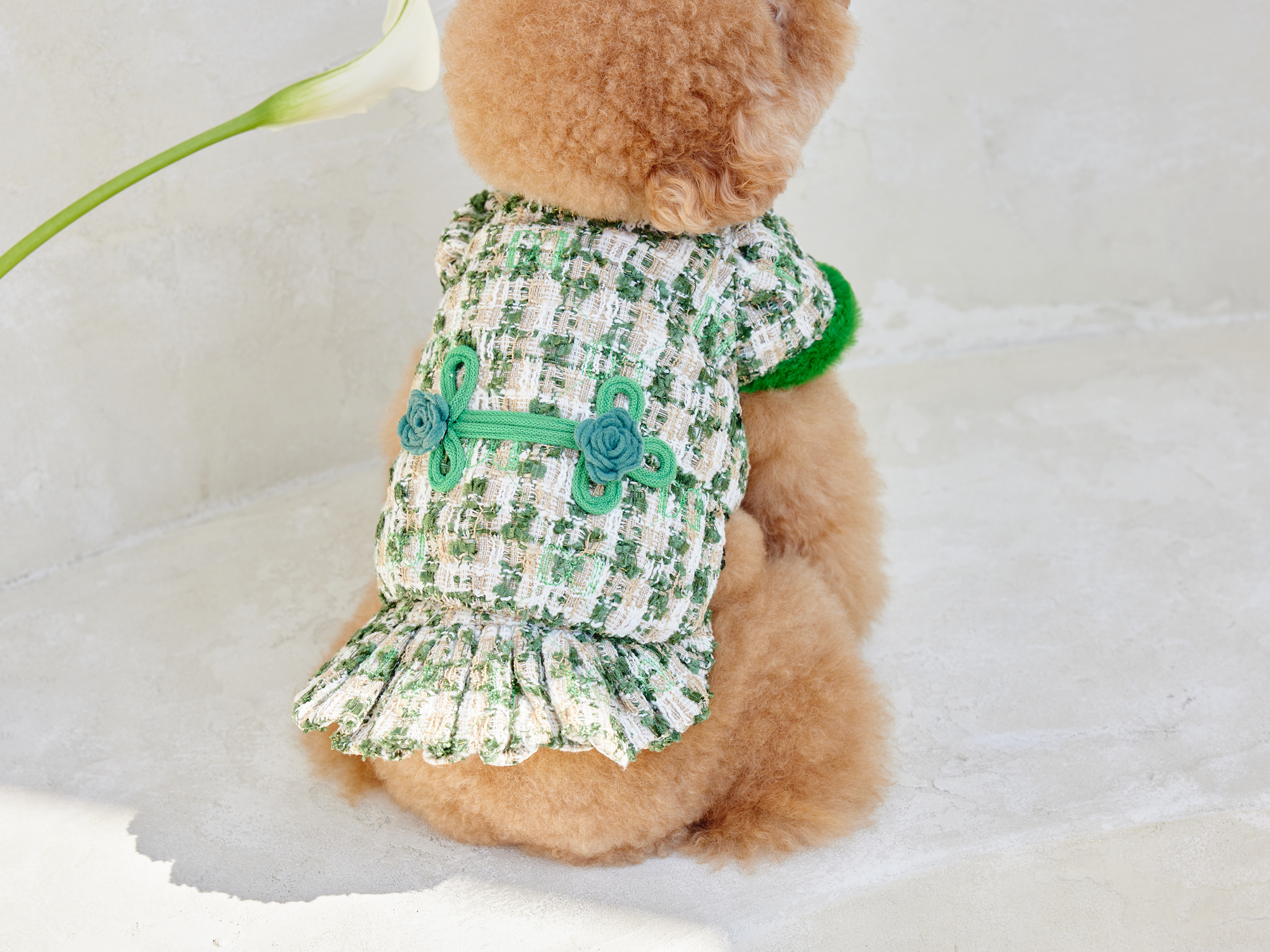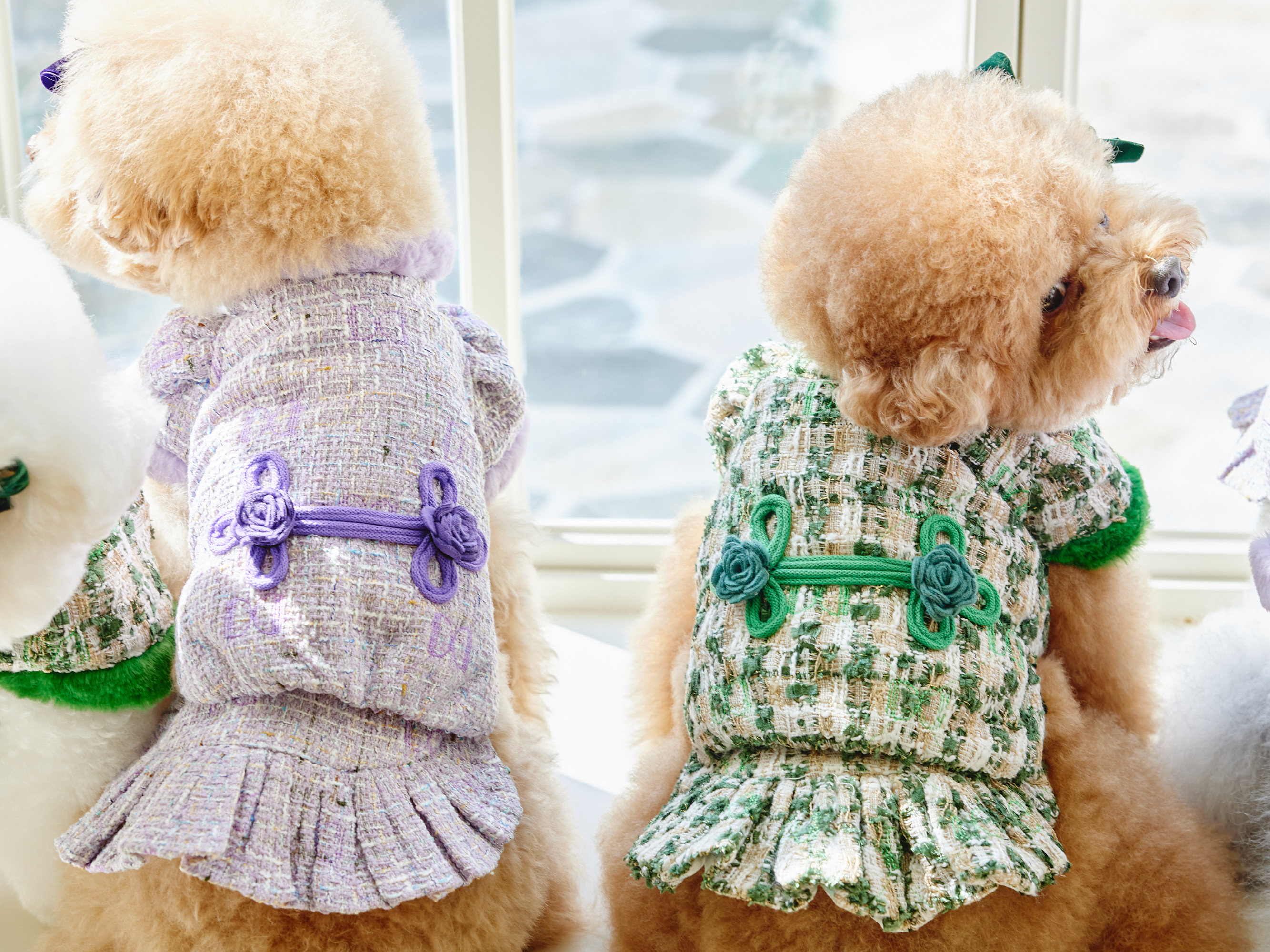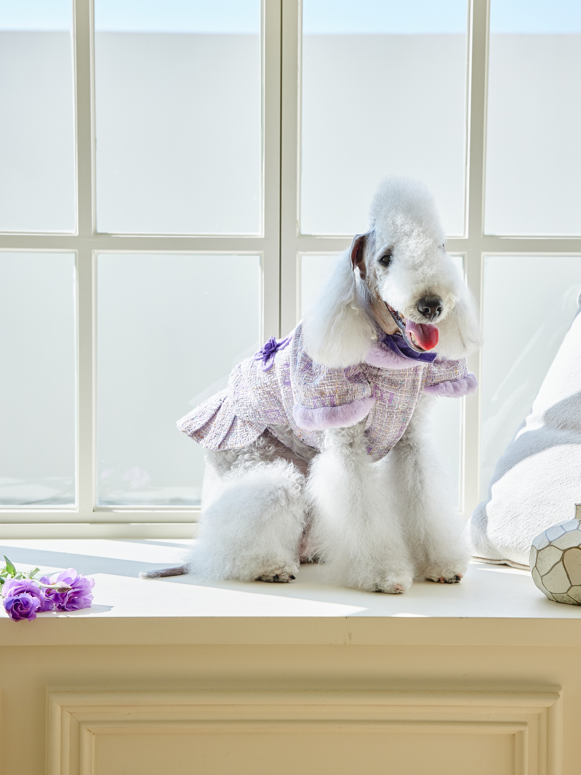 예쁜 트위드 원단에 컬러 라이닝을 넣고 디자인포도그 자수를 박은 자켓에